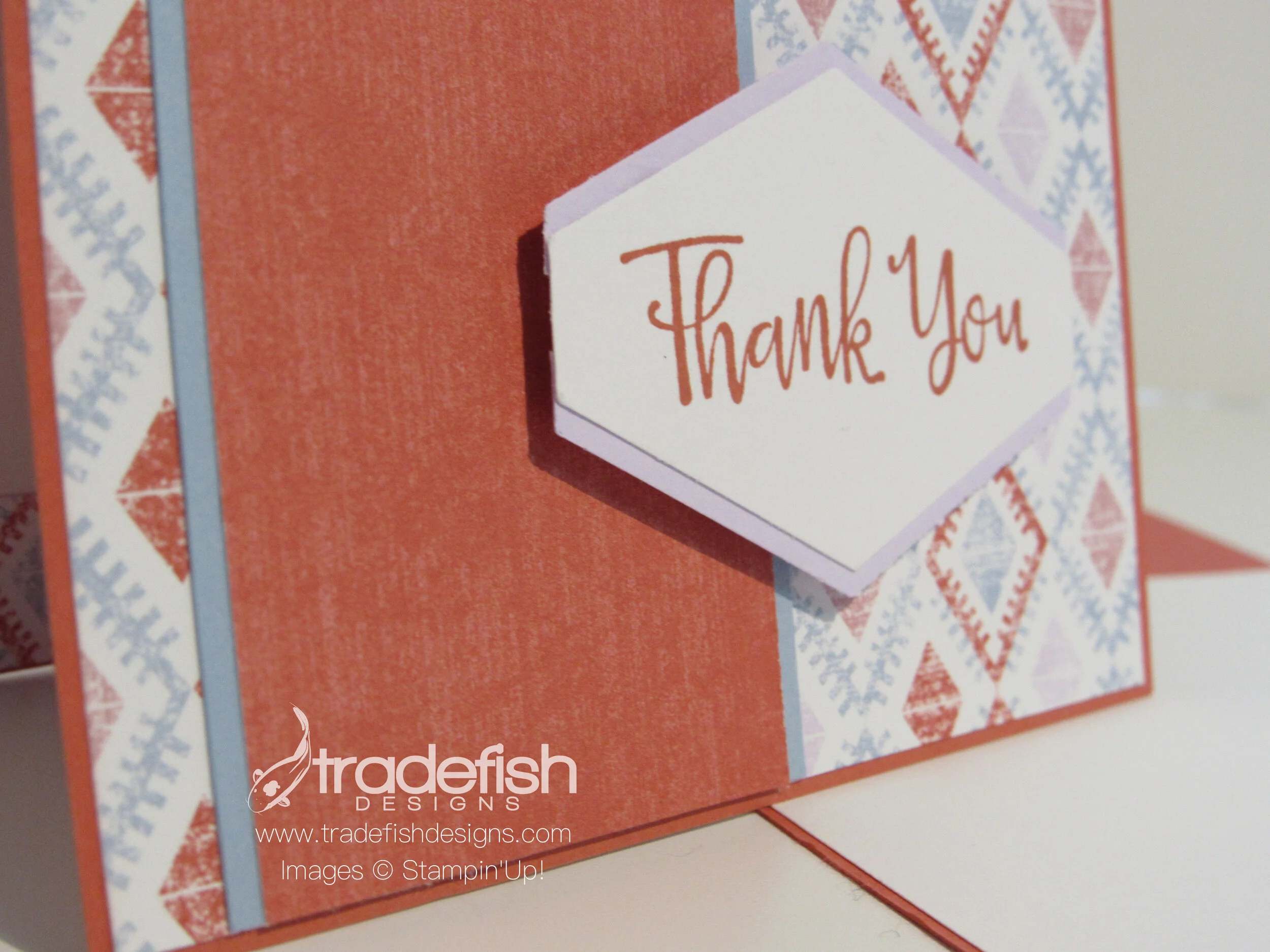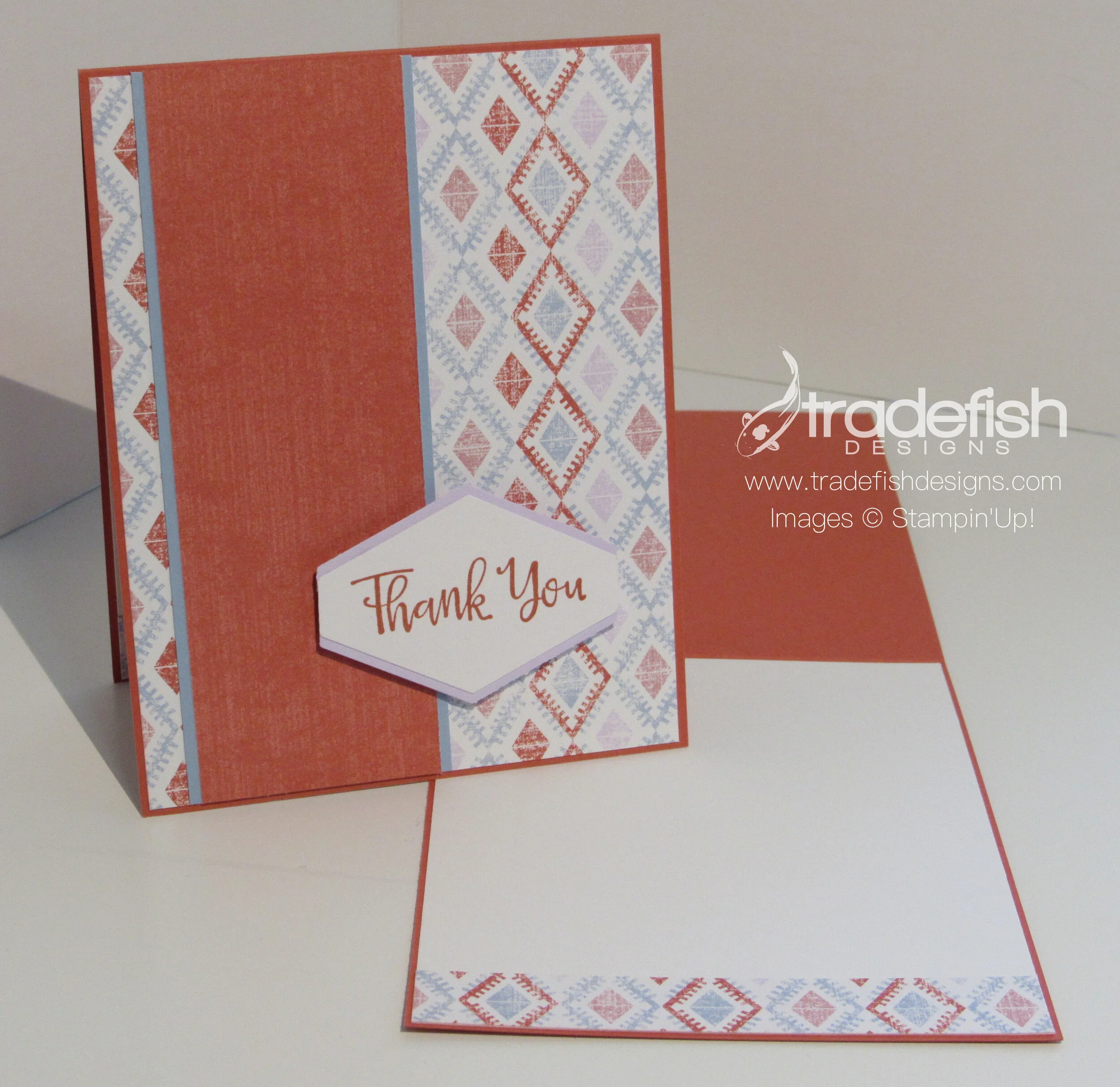 Here’s a fun and simple Thank You card. This is an easy to use card for a man or a woman. I started off with the Stampin’ Up Designer Series Paper called Woven Threads. I love the patterns because they’re not overly feminine. I also love the colors used…I love the Terracotta Tile from Stampin’ Up as the A2 card base (which is half of an 8-1/2 x 11 sheet of cardstock folded down the middle). It’s a rusty colors that works well here.
