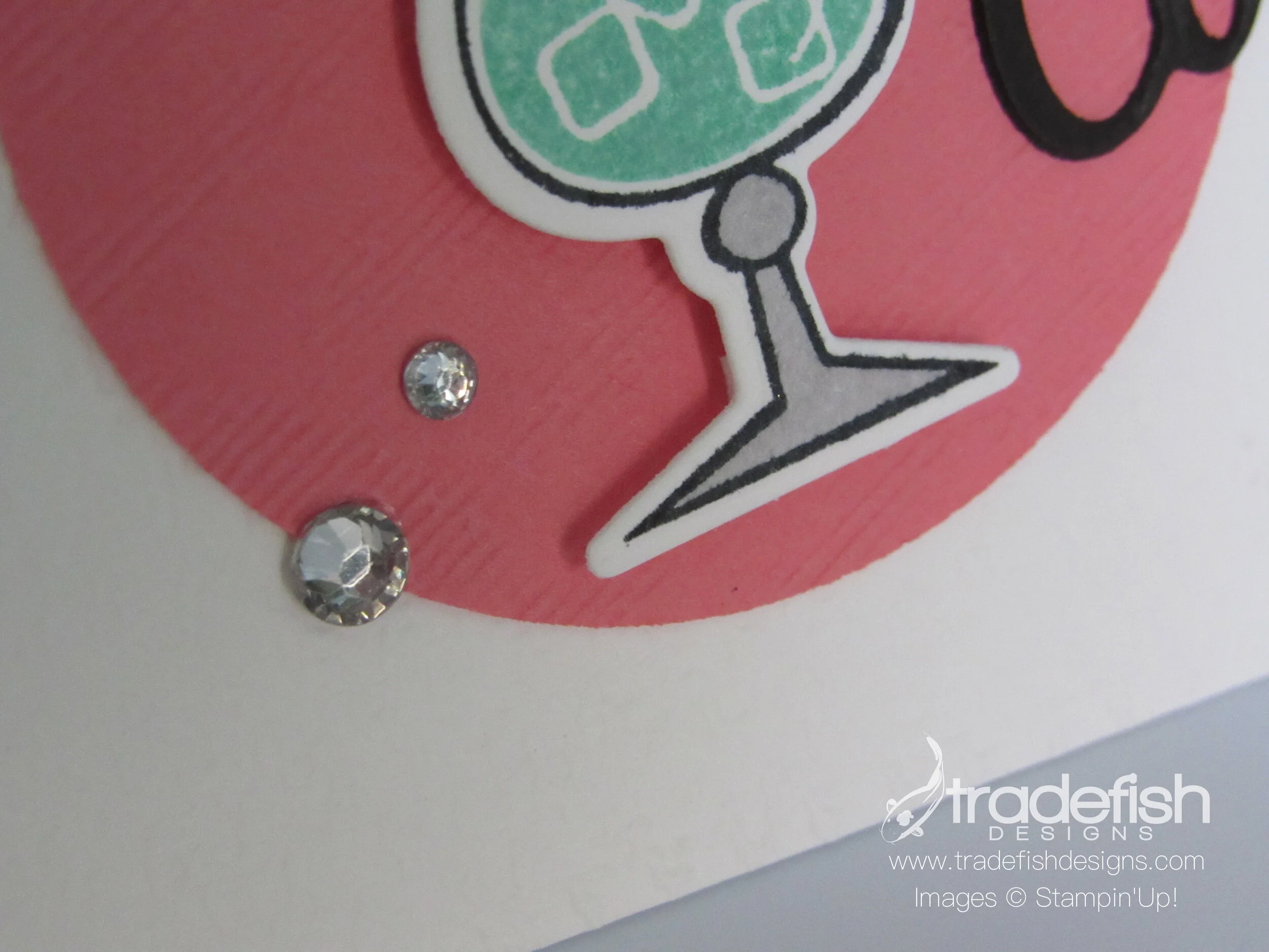 Here’s a close up of the front of the card that shows off the decorative rhinestones and the separate embossing I did on the circle die. There’s also a nice close up of the coloring of the cocktail stem.