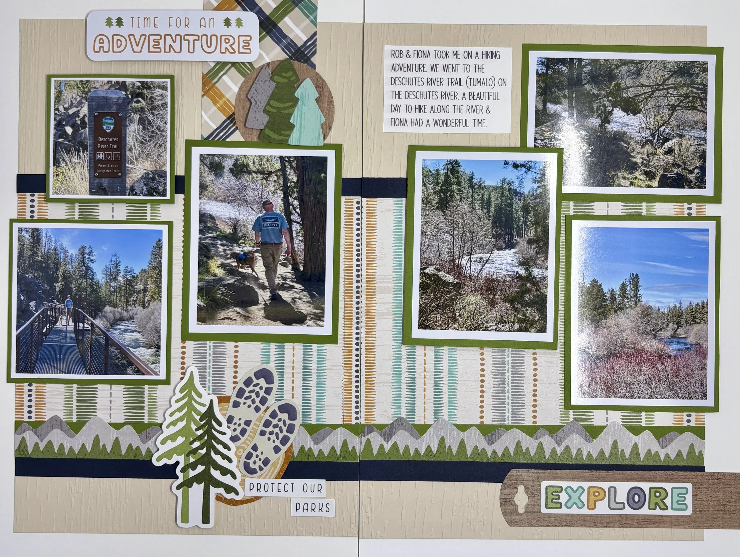 We have created a monster in Fiona. She now expects daily walks…rain, shine or even snow. Yes, you heard me…while it is actively snowing. Well we are now past that gratefully. Yes, I knocked on wood just in case. Today’s post highlights the walk/hike we took at the Deschutes River Trail in Tumalo, Oregon. It was an absolutely beautiful day and I took advantage of a double page spread in my Creative Memories 2026 Scrap Journal where I capture the everyday and not just the holiday. This layout features a collection I purchased in a Secret Box from last year with Creative Memories. That box is not longer available but they do still have Secret Box #4 from last year….and the Secret Boxes are going to continue in 2026…word on the street is that Secret Box #1 for 2026 will be coming soon. Don’t worry, I will let you know all about it when it comes.